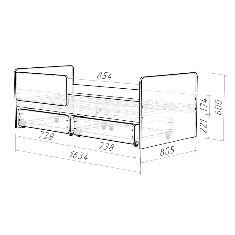 3. Выкатные ящики: Кровать оснащена двумя выкатными вместительными ящиками, которые оборудованы прямоходными колесами для легкости использования. Это удобное решение для хранения игрушек, постельного белья или других вещей.