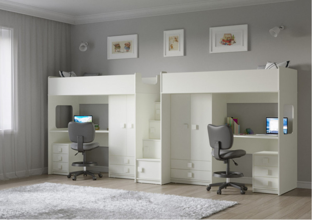 Две кровати, два шкафа, две рабочих зоны с тумбами – одна лестница. Идеальный вариант для двоих детей!