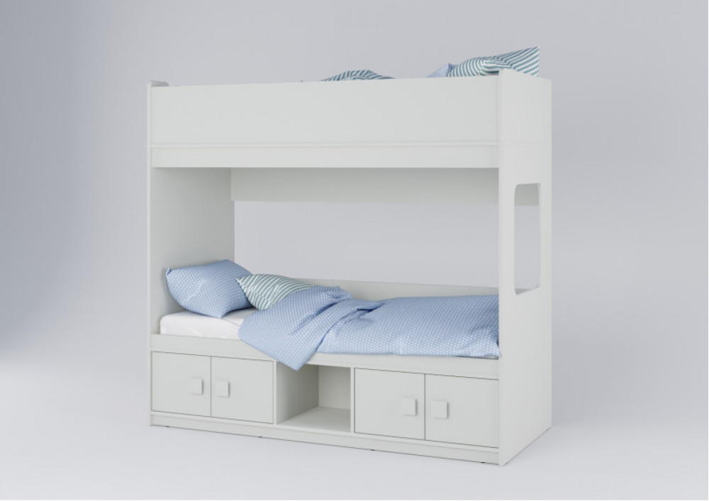 Классическая детская двухъярусная кровать с двумя параллельными спальными местами размером 1750х750 и 1900х750 и закрытыми местами хранения.